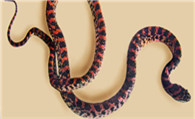 赤练蛇的成体全长约1米左右,体背黑褐色与红色相间。因具有51~87+12~30以上的红色窄横纹而得名,但部分个体缺少红纹。颊鳞常入眶。头背黑色,鳞缘红色,枕部有一“∧”形红色斑,眶后有一黑纹向后达第7枚上唇鳞。背鳞平滑,或体后段的中央少数几行微棱,19(17,20,21)— 17(19)—15(17),福建崇安一标本中段行数为21。腹鳞雄188—224,雌184—222。