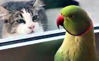 美食可看不可吃 喵星人被鸟朋友安排“躲猫猫”