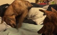 汪抢不到玩具气到埋床狂抓 暗示马麻我也想要