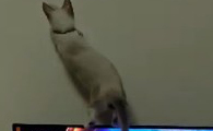 调皮猫抓蚊子跳到电视机 不料双脚没踩稳直接摔惨