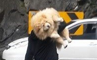 扛山猪上车 41公斤松狮犬被爸爸一肩扛起