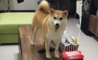 柴柴从沙发玩到桌上怕高不敢下来 等待马麻救星