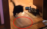 怪癖黑猫不喜欢厨房木地板 跳跳蛙变身成超人