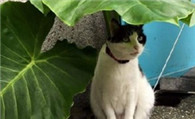 猫咪蹲在叶下躲雨很像电影剧情 呆萌表情超可爱