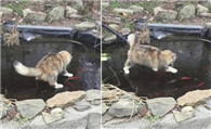 傻猫不知水面结冰 来回追赶鱼就是抓不到