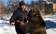 俄罗斯男子把熊当宠物来养 在雪地玩摔跤