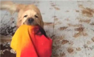 黄金猎犬叼毛巾邀功 踩的满屋都是脚印子