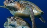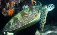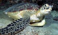绿海龟头略呈三角形,为暗褐色,两颊黄色,颈部深灰色,吻尖,嘴黄白色,鼻孔在吻的上侧,眼大,前额上有一对额鳞,上颌无钩曲,上下颌唇均有细密的角质锯齿,下颌唇齿较上颌长而突出,闭合时陷入上颌内缘齿沟,舌已退化。背腹扁平,腹甲黄色,背甲呈椭圆形,茶褐色或暗绿色,上有黄斑,盾片镶嵌排列,具由中央向四周放射的斑纹,色泽调和而美丽。中央有椎盾5枚,左右各有助盾4枚,周围每侧还有缘盾7枚。四肢特化成鳍状的桡足,可以像船桨一样在水中灵活地划水游泳。